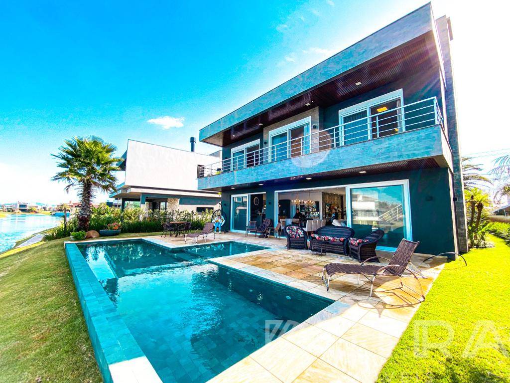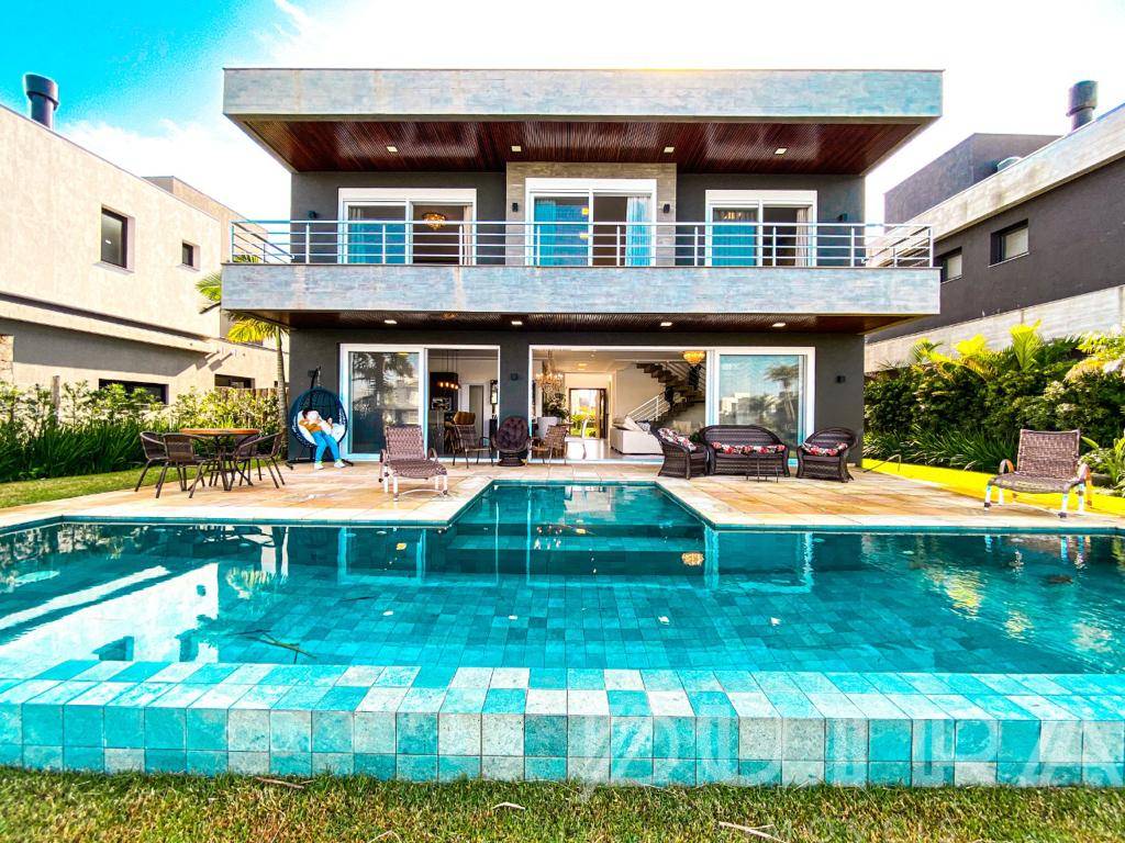 Belíssimo Sobrado em Condomínio de Xangri-lá, FINAMENTE MOBILIADO E DECORADO, composto por 5 suítes, banheiro social, lavabos, cozinha americana equipada, churrasqueira, sala de estar/jantar com eletrodomésticos de última linha, living 3 ambientes, lareira, esperas para splits, água quente, hidrometro individual, esquadrias em PVC, teto rebaixado em gesso, piso porcelanato, área de serviço, piscina e 2 vagas para carro. Condomínio com alta infraestrutura e segurança, quadras poliesportivas, academia, salão de festa, espaços para lazer em família, lago, guarita 24hrs e porteiro. Adquira já esse belíssimo imóvel por apenas 5.500 mil + honorários.
